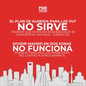 Ante el fracaso de estos planes, y un nuevo proyecto que la portavoz socialista ha calificado como “ineficaz” para la ciudad ya que traslada el fenómeno de las VUT desde el centro a los barrios, el grupo socialista ha presentado alegaciones que contemplan redactar de nuevo el Plan Reside para que sea «más ambicioso y acorde a las necesidades» de Madrid.